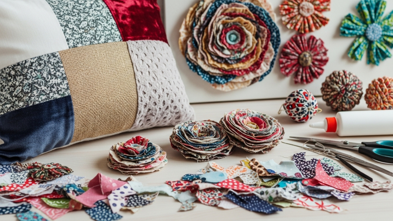 Your scraps don’t have to sit in boxes forever. Turn them into pieces that brighten your home. You could make table runners or coasters, which are functional, and use patchwork designs for wall-hangings or cushion covers, which are great decorative ideas. A small vase filled with fabric flowers can brighten up a room with a splash of color.